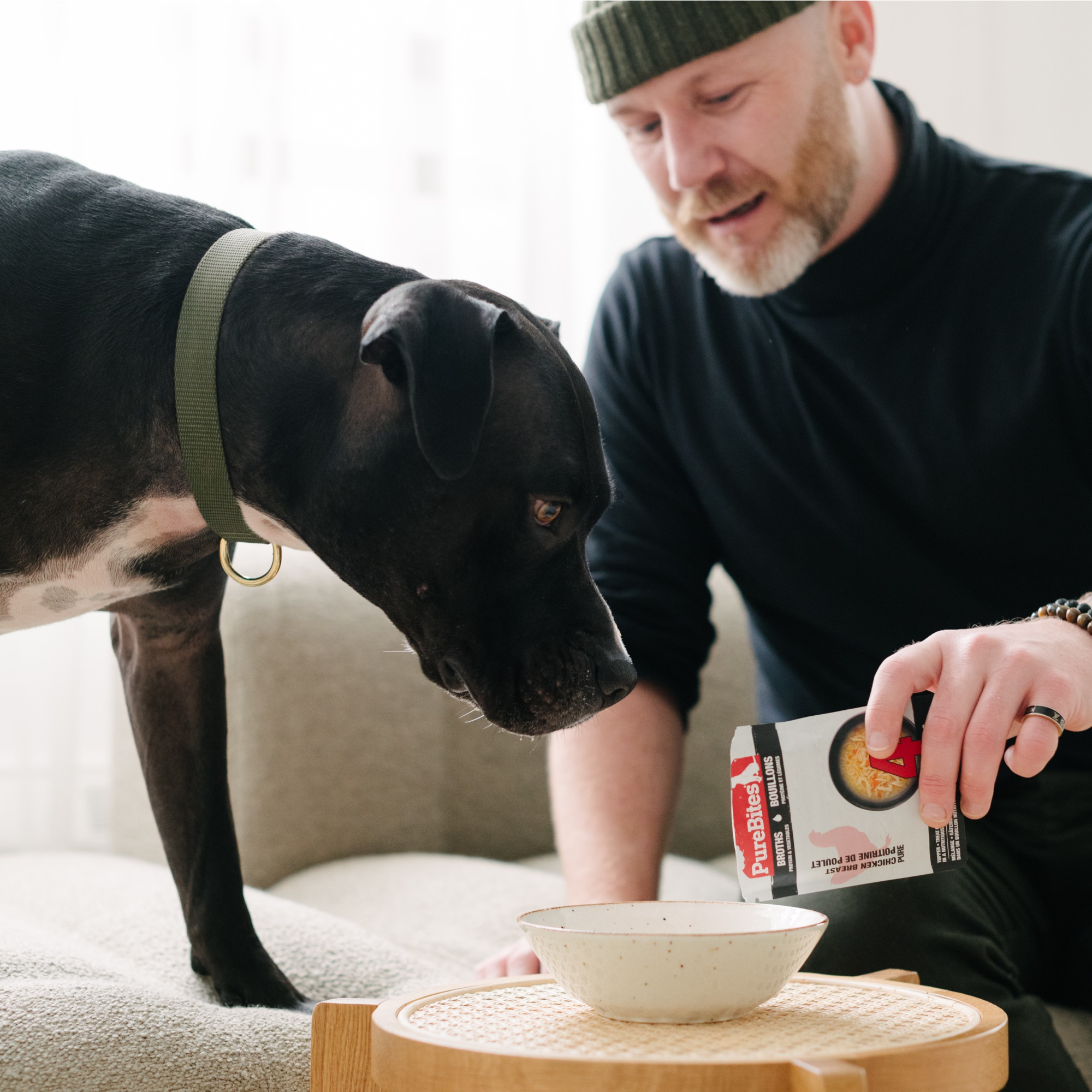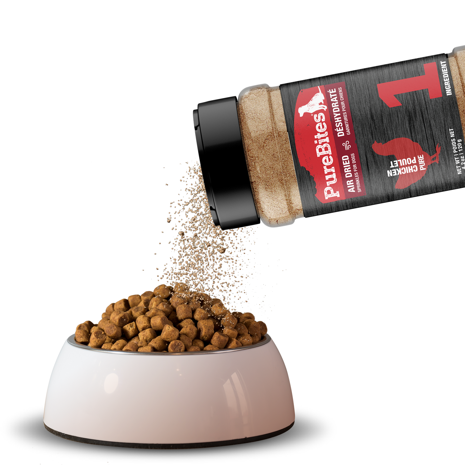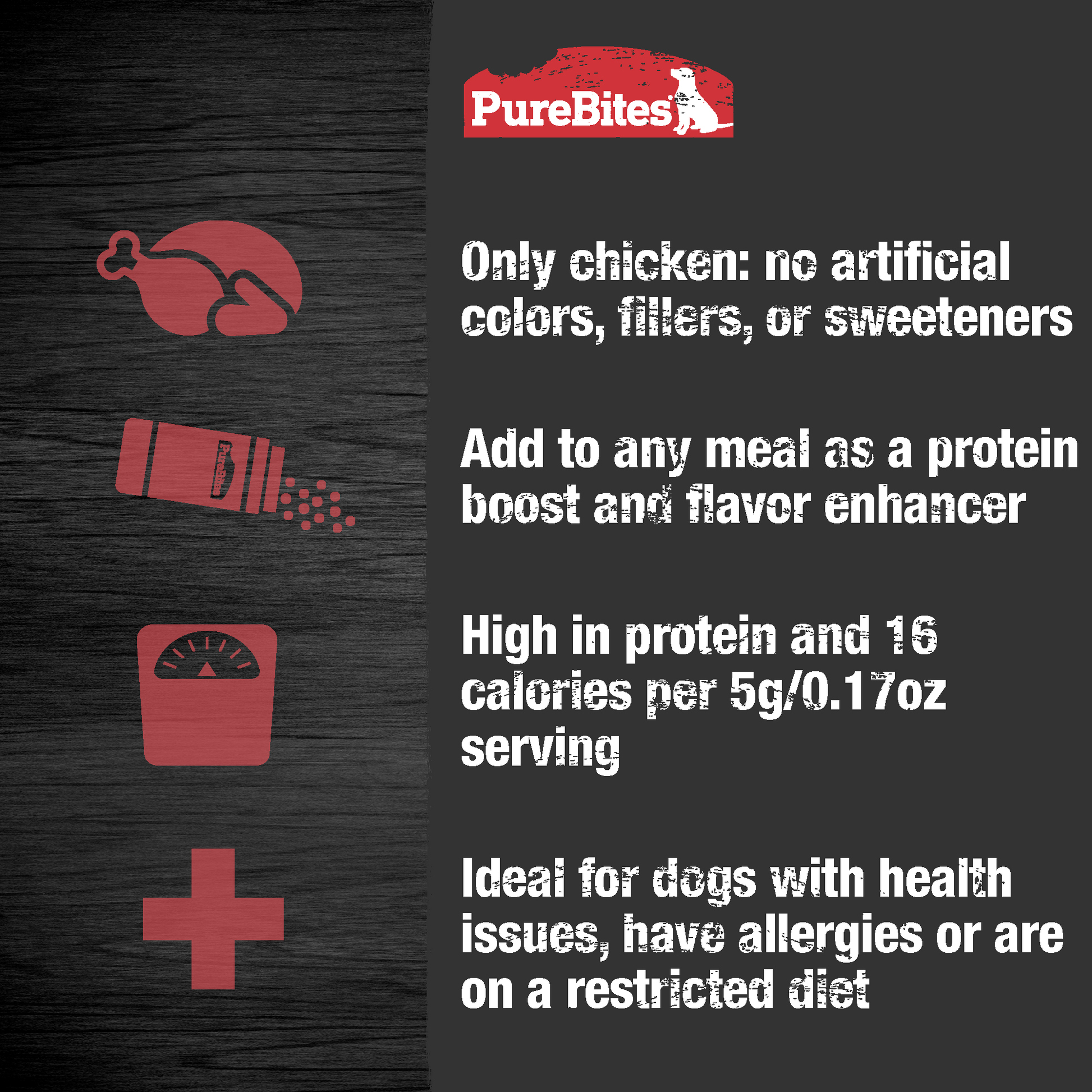 At PureBites, we’re always asking pet parents to “Go ahead, turn the bag around and look at our ingredients”. Simplicity and the high-quality ingredients we choose to feed our family makes a difference. At PureBites this means every member of our family. Our PureBites air dried sprinkles for dogs are the ultimate healthy topper or mixer. Made with only 1 simple human grade ingredient you can read, pronounce, and trust: 100% pure chicken. Nothing else. No artificial colors, fillers, sweeteners, or glycerin. Proudly sourced and made in Thailand using a delicate air drying process at low temperatures to help preserve fresh RAW whole food, locking in the taste dogs crave and high protein/low calorie nutrition that pet parents love.