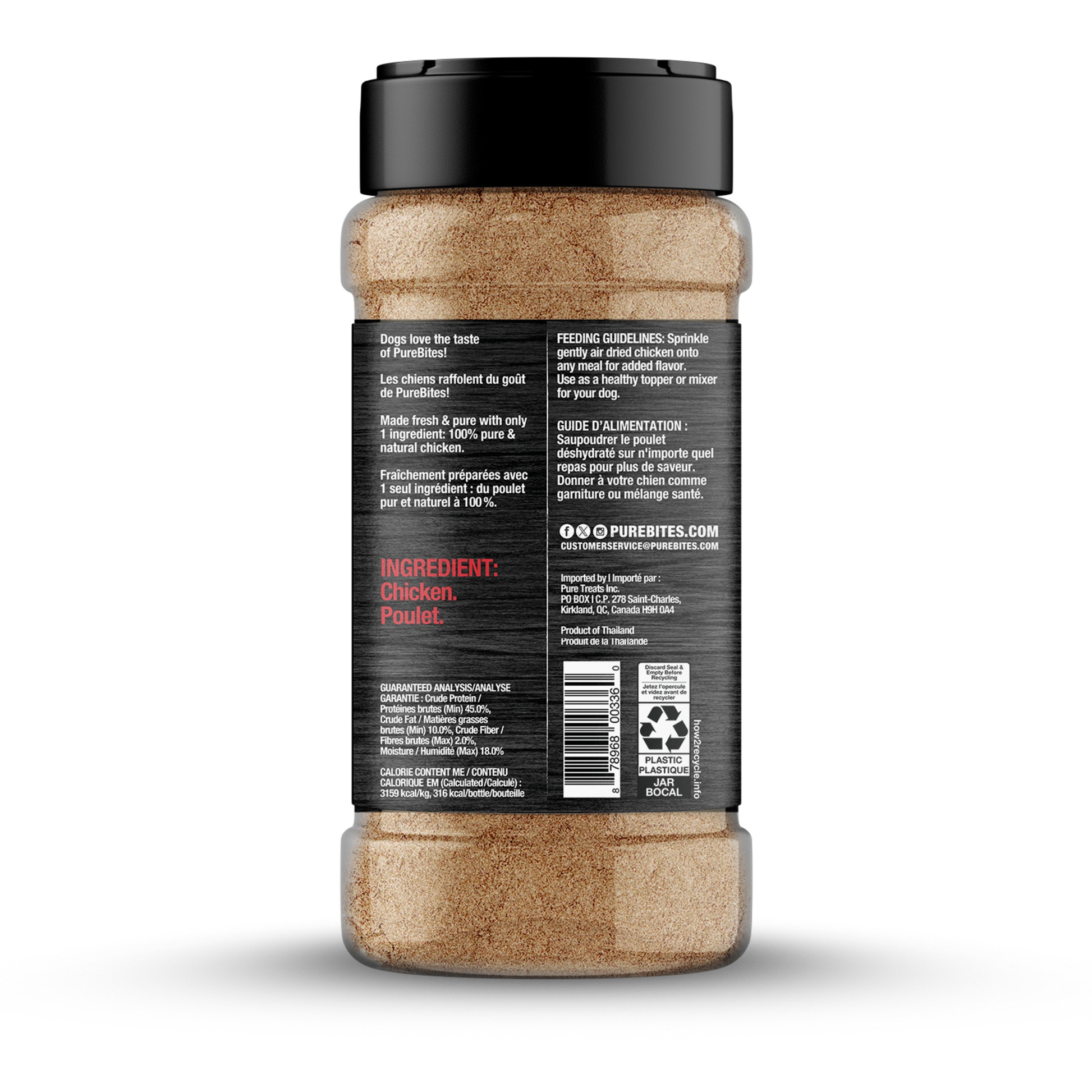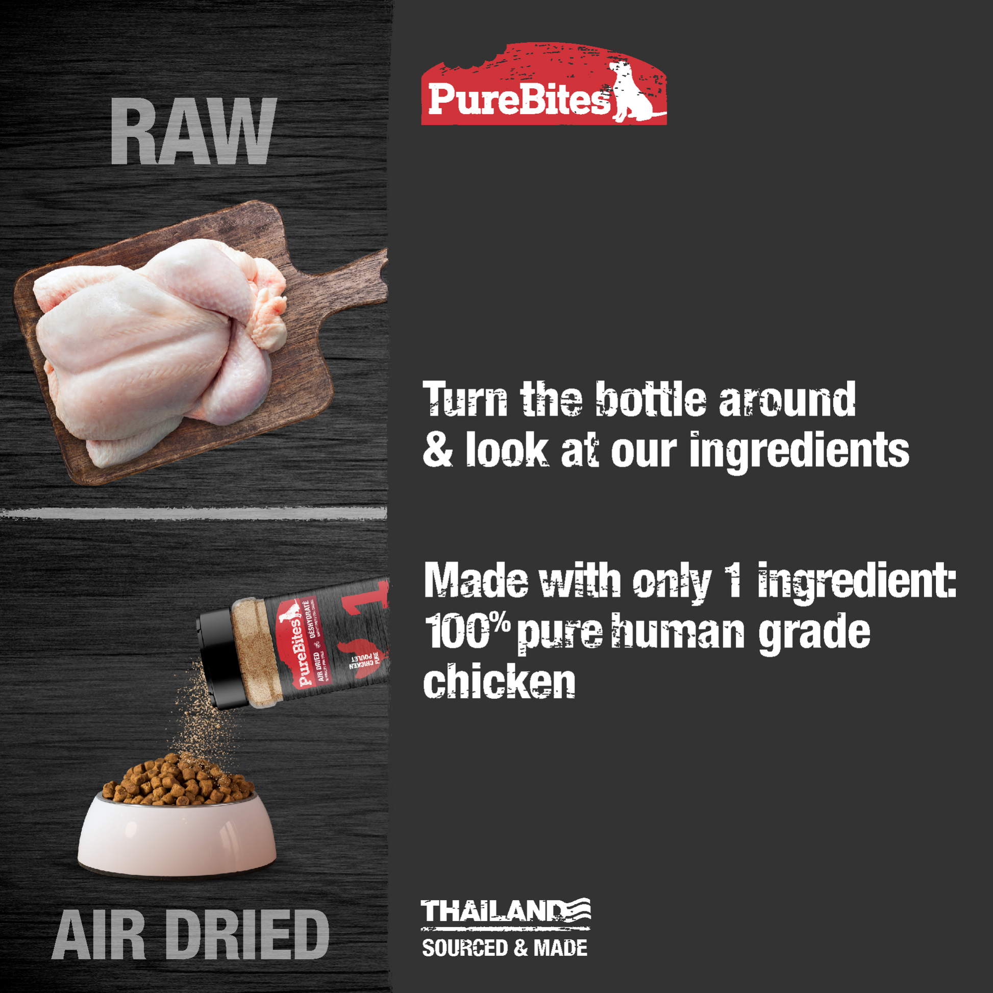 - Turn the bottle around and look at our ingredients; made with only 1 simple human grade ingredient: 100% pure chicken; proudly sourced and air dried RAW in Thailand; a great healthy topper or mixer for your dog