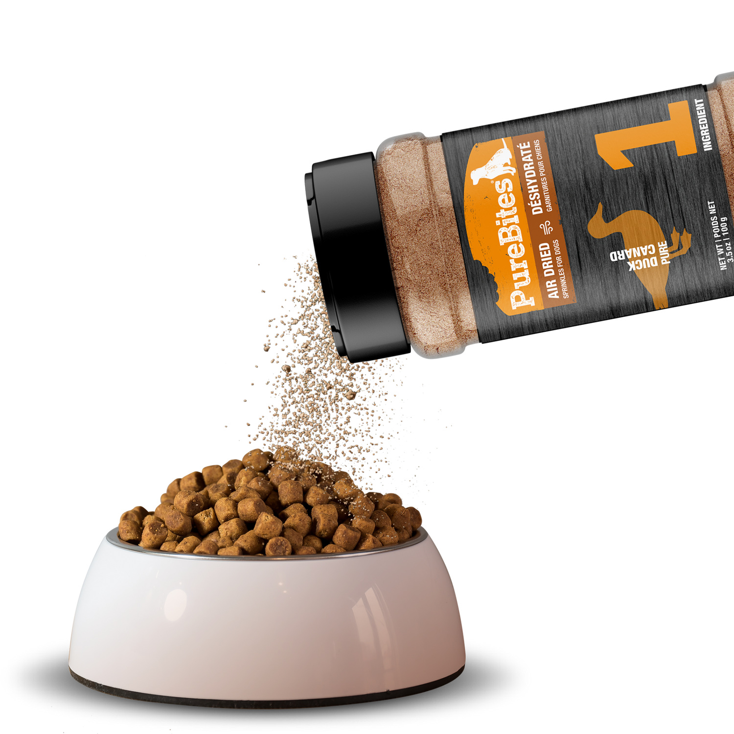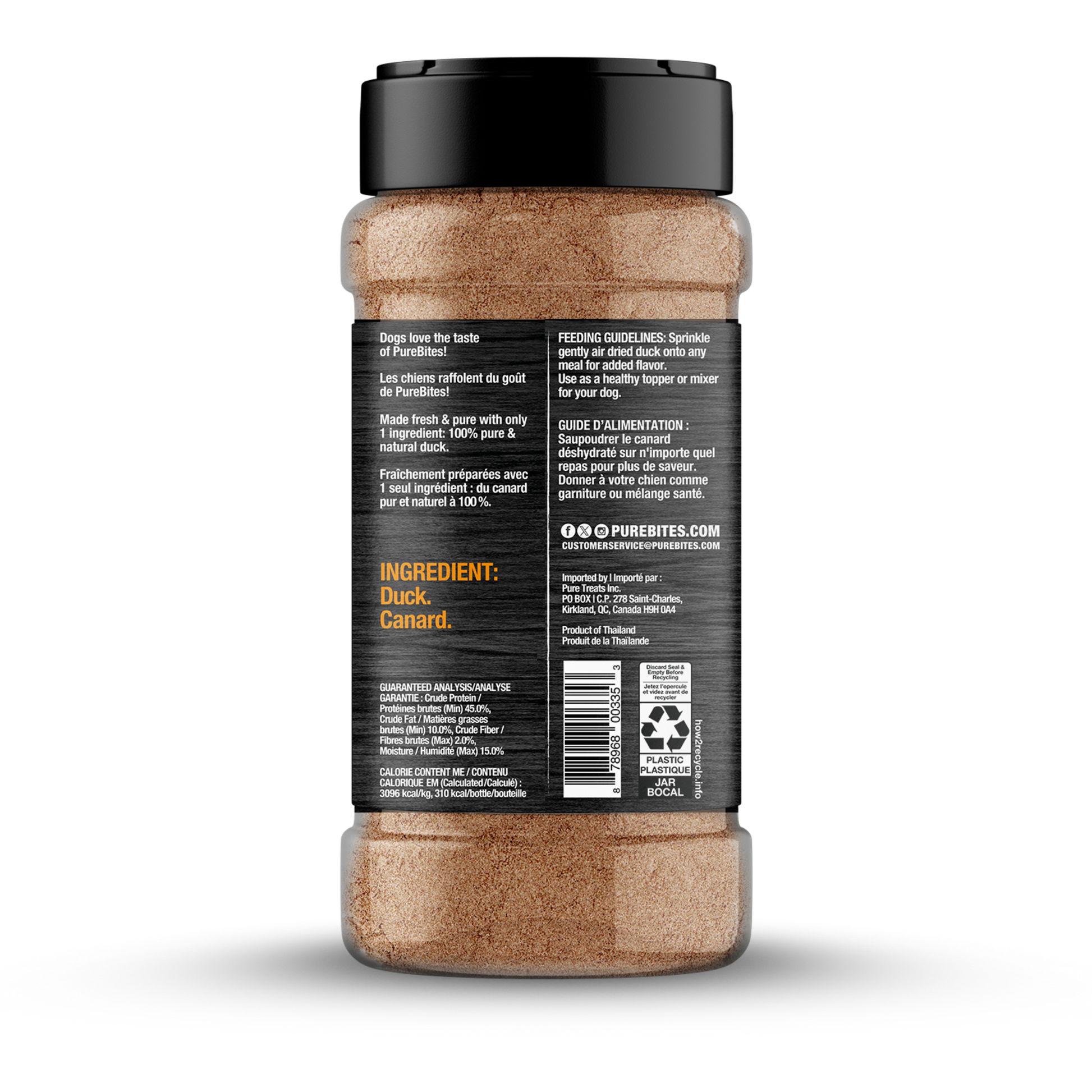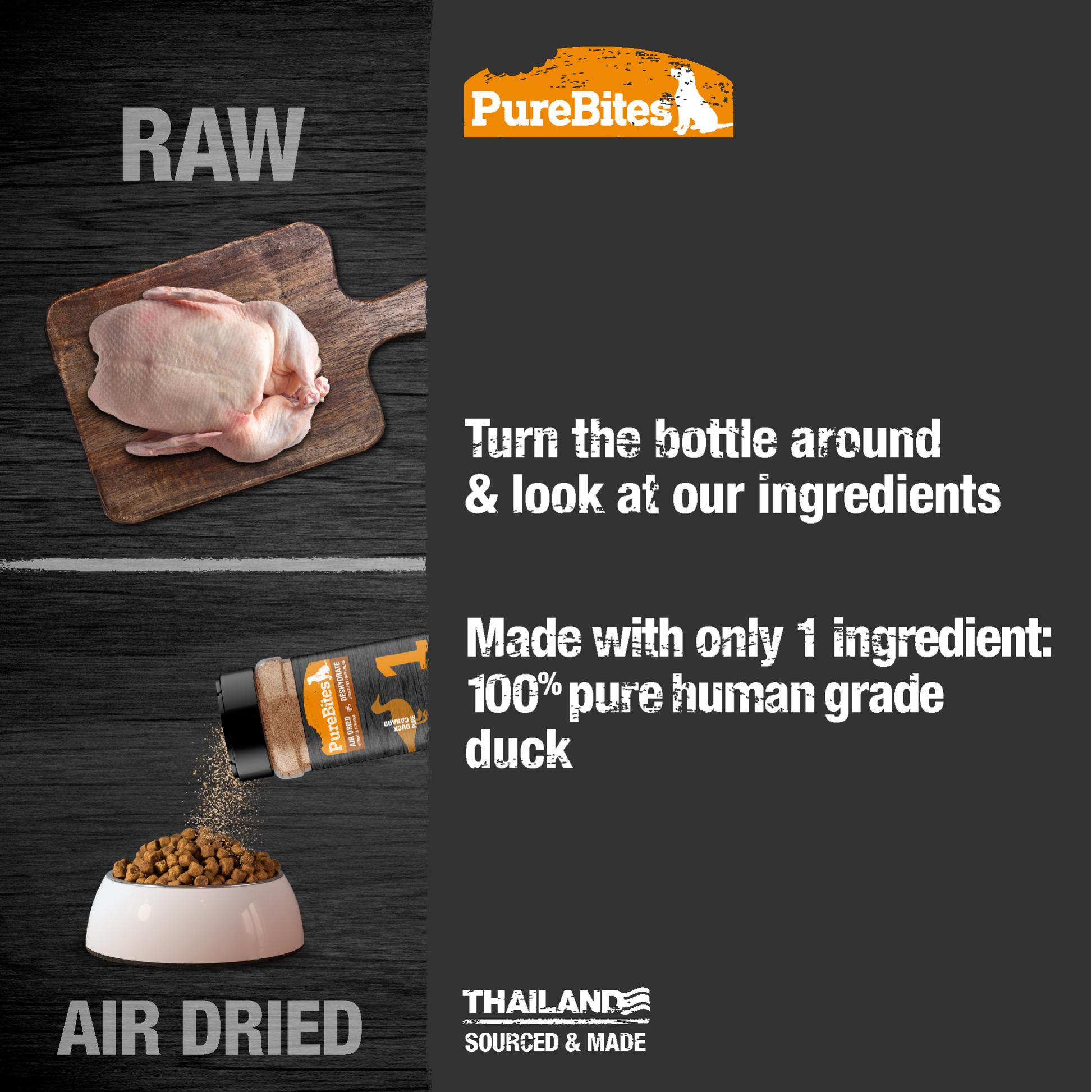 - Turn the bottle around and look at our ingredients; made with only 1 simple human grade ingredient: 100% pure duck; proudly sourced and air dried RAW in Thailand; a great healthy topper or mixer for your dog