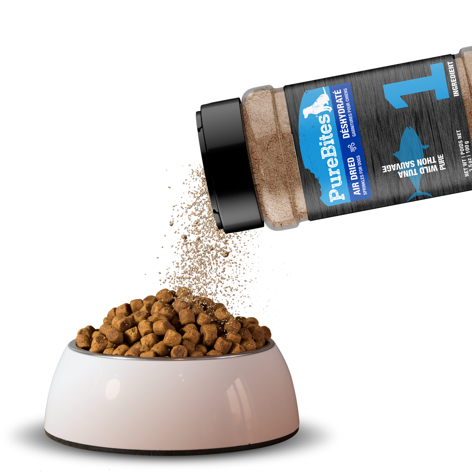 At PureBites, we’re always asking pet parents to “Go ahead, turn the bag around and look at our ingredients”. Simplicity and the high-quality ingredients we choose to feed our family makes a difference. At PureBites this means every member of our family. Our PureBites air dried sprinkles for dogs are the ultimate healthy topper or mixer. Made with only 1 simple human grade ingredient you can read, pronounce, and trust: 100% pure wild tuna. Nothing else. No artificial colors, fillers, sweeteners, or glycerin. Proudly sourced and made in Thailand using a delicate air drying process at low temperatures to help preserve fresh RAW whole food, locking in the taste dogs crave and high protein/low calorie nutrition that pet parents love.