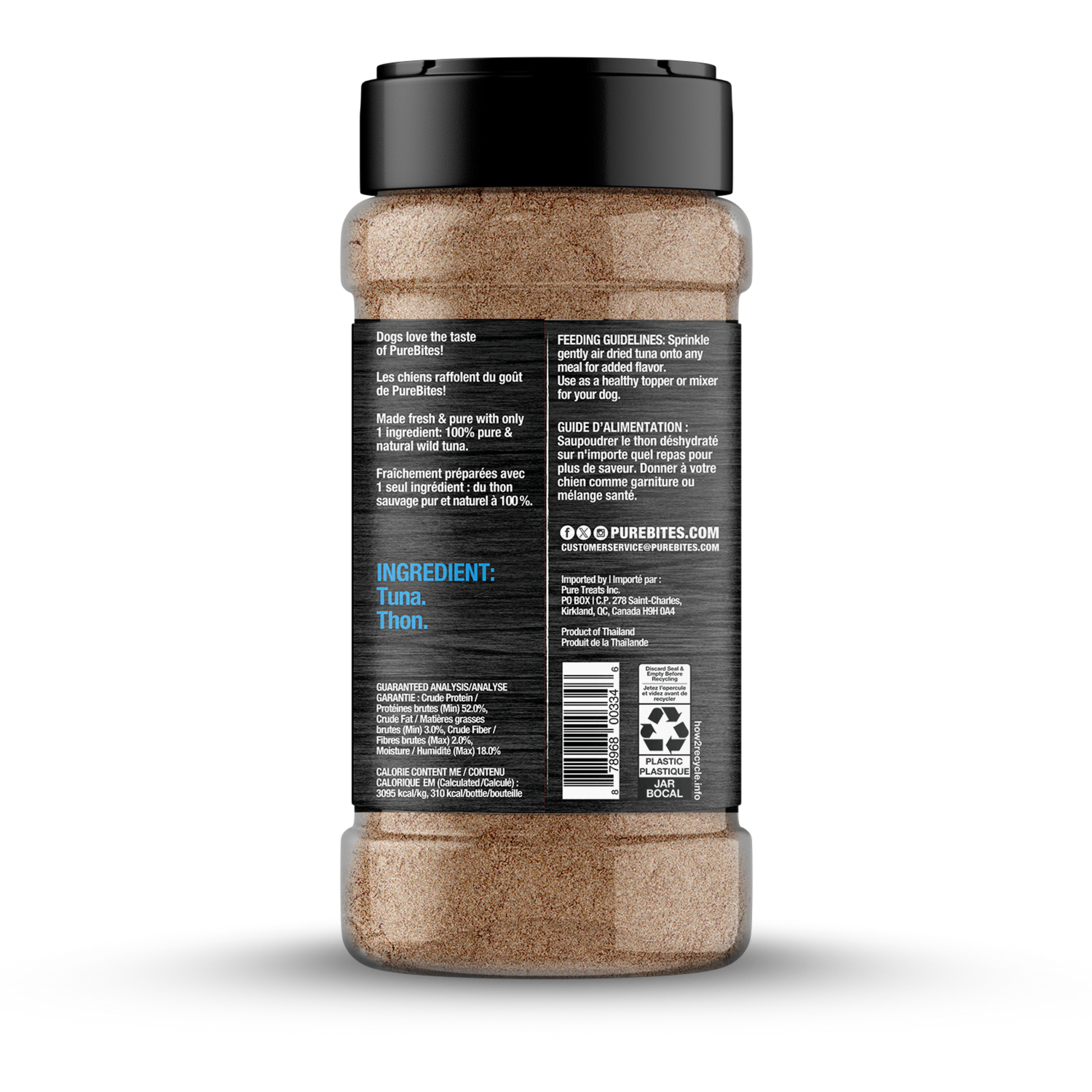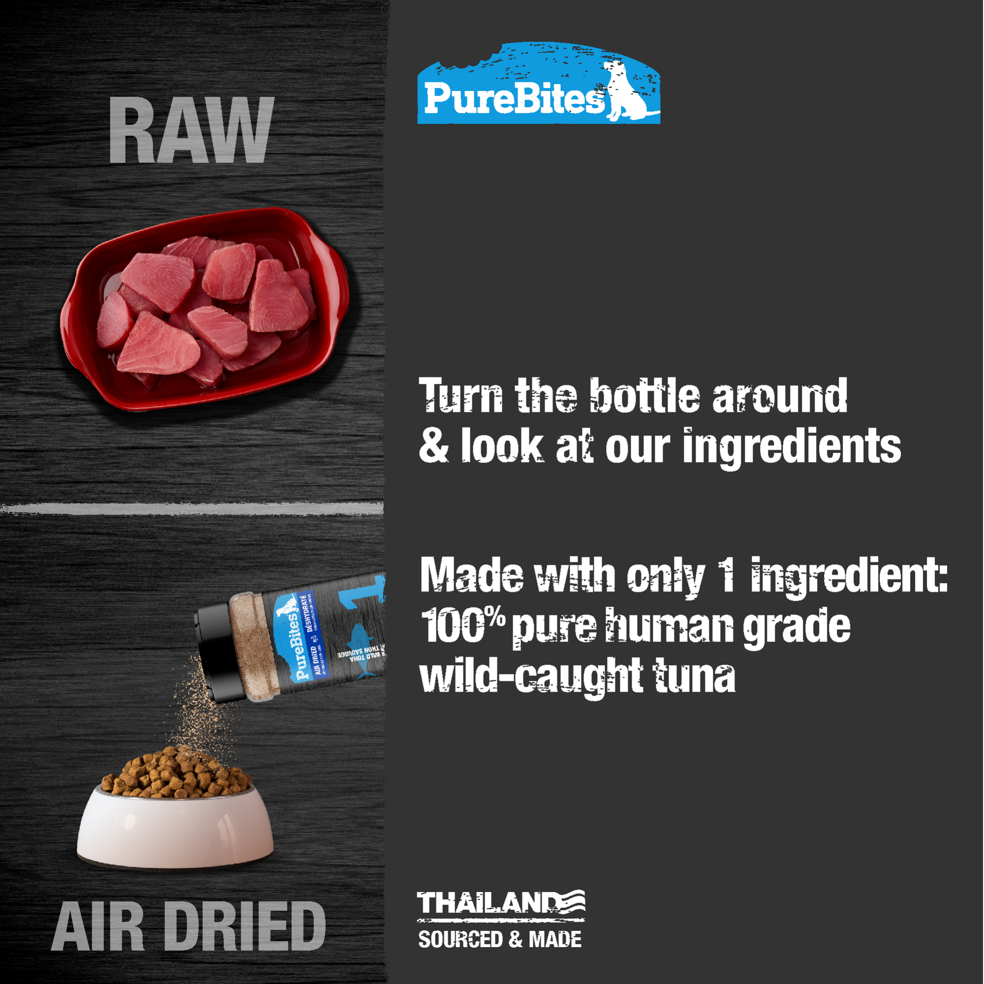 - Turn the bottle around and look at our ingredients; made with only 1 simple human grade ingredient: 100% pure wild tuna; proudly sourced and air dried RAW in Thailand; a great healthy topper or mixer for your dog