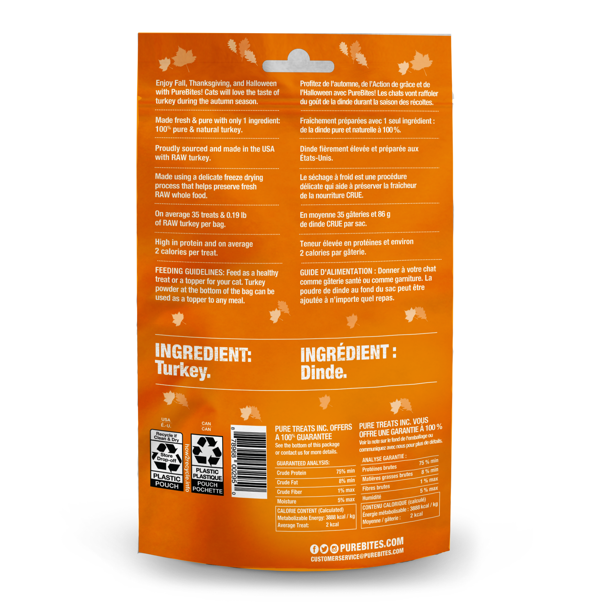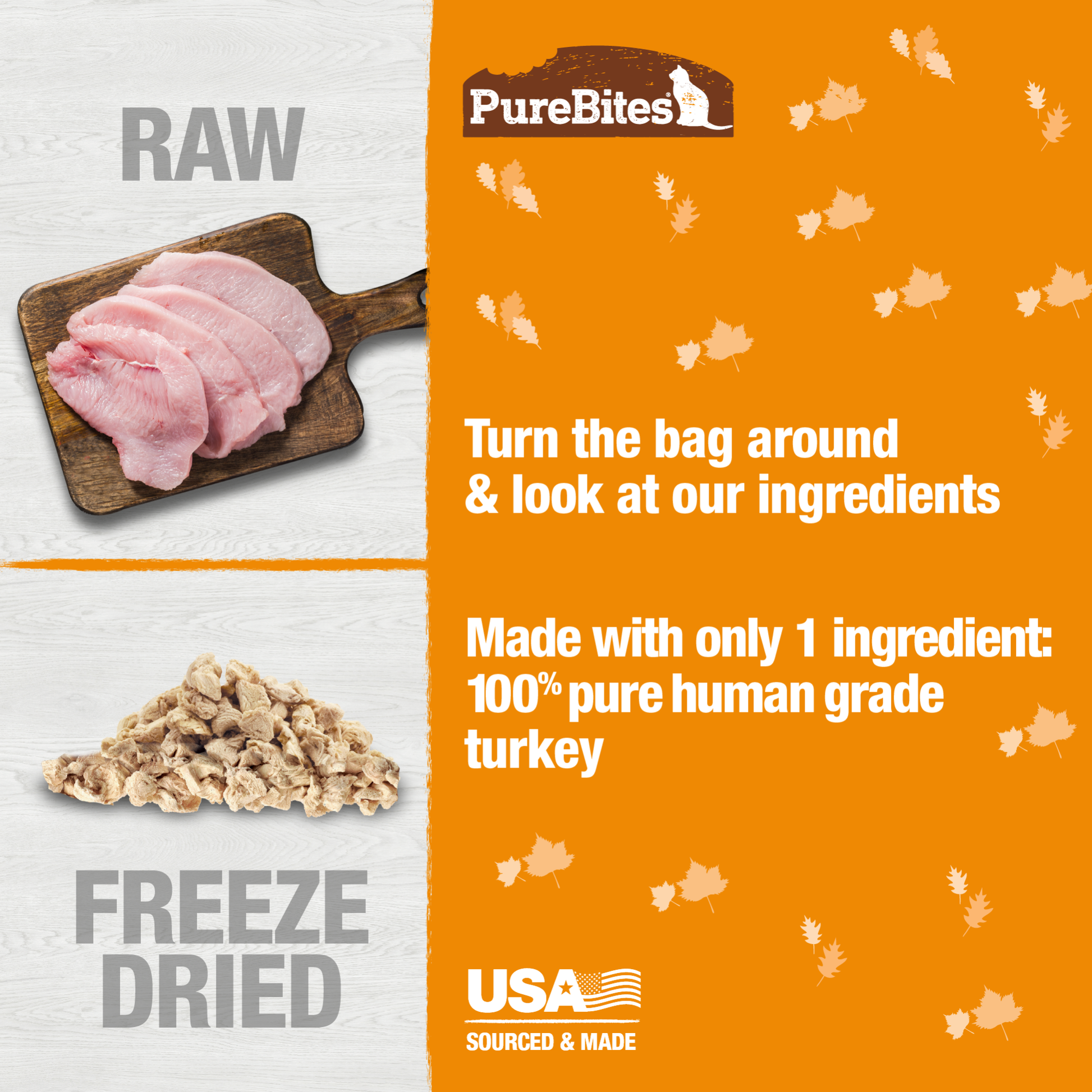 - Enjoy fall, Thanksgiving, and Halloween with PureBites! Made with only 1 simple human grade ingredient: 100% pure turkey; proudly sourced and freeze dried RAW in the USA; a great high-value treat or topper for your cat